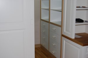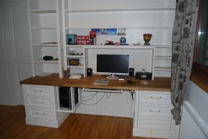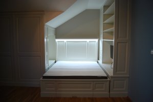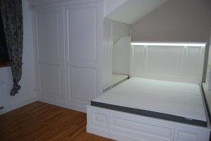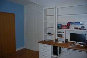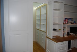 Začátkem spolupráce byla složitá domovní předsíň, kde jsme realizovali vestavěné skříně s profilovými masivními dvířky, věšák s okrasnou římsou a praktický kryt na radiátor. V průběhu dalších měsíců a let se interiér rozrostl o šatnu v patře a velmi složitý, ale praktický chlapecký pokoj.