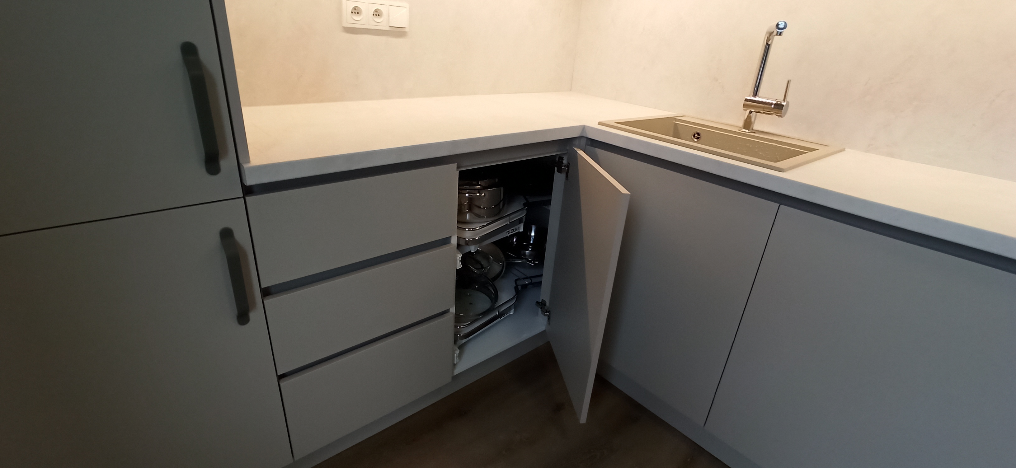Tato elegantní kuchyňská linka byla navržena s důrazem na maximální využití prostoru a funkčnost. Kombinace světlých matných dvířek, integrovaného LED osvětlení a vestavěných spotřebičů vytváří čistý a nadčasový design. Rohová skříň je vybavena výsuvným mechanismem pro pohodlné uložení hrnců a nádobí. Ideální řešení pro menší kuchyňské prostory bez kompromisů na estetice a praktičnosti.
